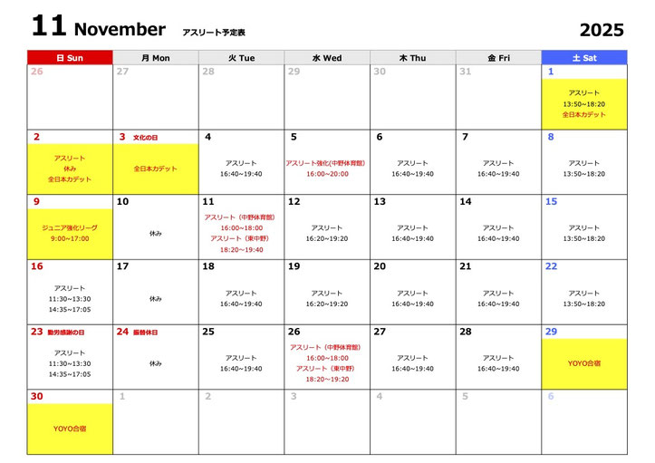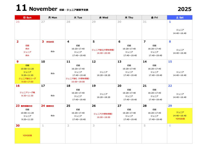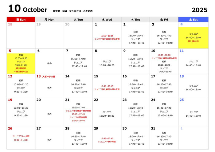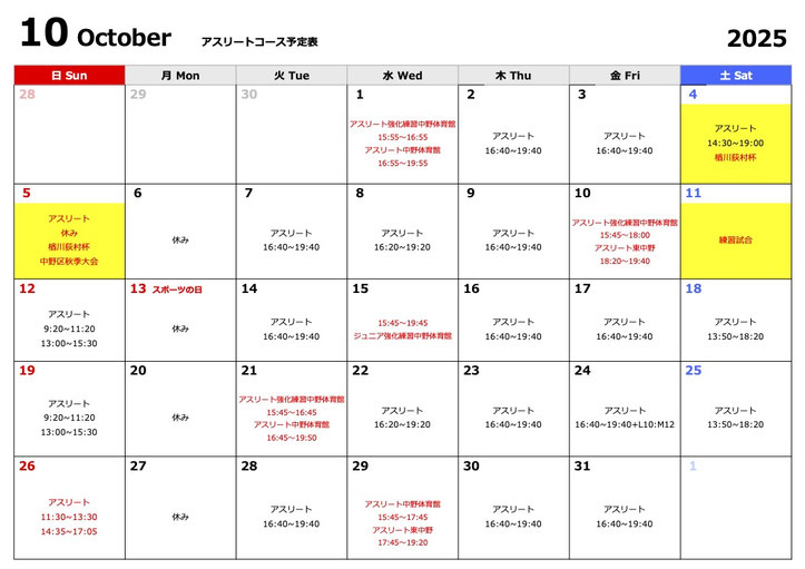 【10月・11月 東中野 初級・ジュニア・アスリートコース練習予定表🏓】