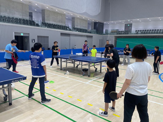 午前に一般(小学生以上)教室、午後に親子卓球教室を行い、参加した皆さんと基本の打ち方や回転のかけ方、ラリーに挑戦したり的当てチャレンジなどをして、一緒に楽しみながら卓球をさせていただきました。